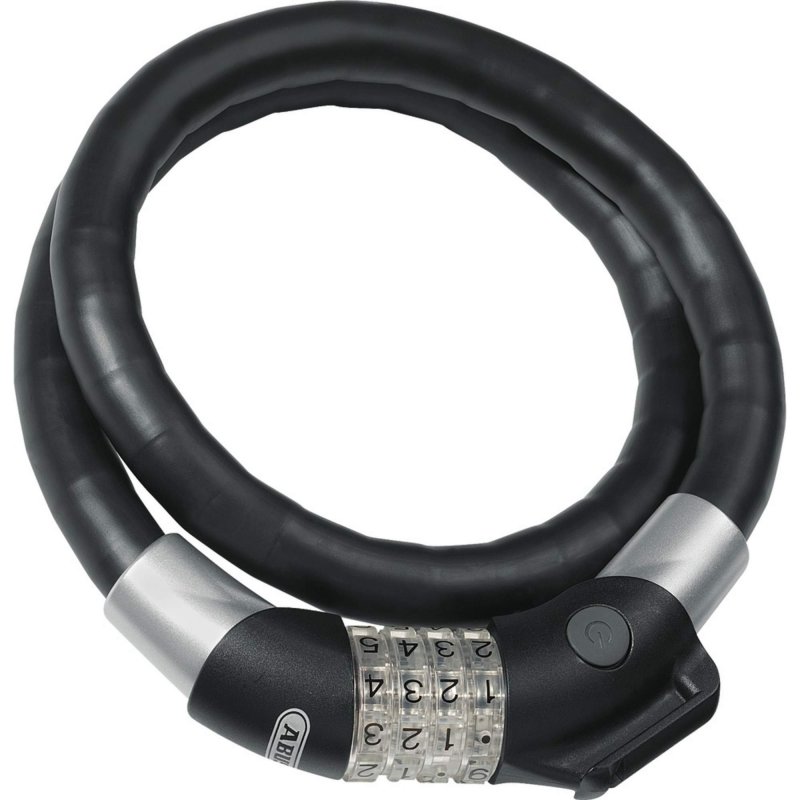 Beleuchtetes Stahlkabel-Zahlenschloss mit vierstelligem Code zur Diebstahlsicherung des Fahrrads. Extraschutz durch überlappende Stahlhülsen über dem innen liegenden Stahlkabel.