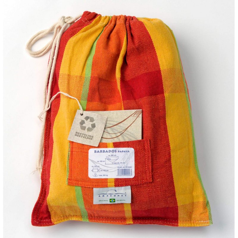 Amazonas nutzt für die Herstellung der Hängematte Baumwoll-Schnittreste – im Normalfall ein Abfallprodukt. Diese Reste werden zu neuem Garn gesponnen. Da die Fasern bei diesem Upcycling relativ kurz sind, werden sie durch Beigabe von max. 15% Polyesterfäden stabilisiert. Verwendet werden nur Ressourcen, die einer strengen Kontrolle (etwa auf Hautverträglichkeit) unterliegen.