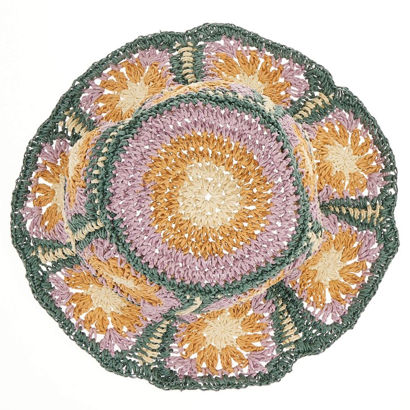 Der trendige Sommerhut wirkt auf den ersten Blick wie gehäkelt, bei genauer Betrachtung erkannt man die durch sein spezielles Material entstandene Strohhaptik. Hierdurch erhält der Hut einen festen Griff, welcher durch einen Draht in der ca. 8 cm breiten Krempe unterstützt wird. Ein umlaufendes Stoffband im Inneren sorgt für bequemen Sitz. Dieser lässt sich dank eines verdeckten Klettbands auch noch ein wenig anpassen. Durch das Blumenmuster in sommerliche Farben erhält der Hut einen tollen Retro-Charm.