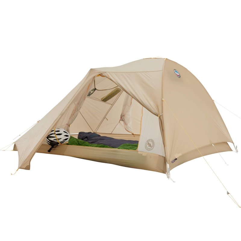 Trotz der geringen Stellfläche wird im Zelt viel Komfort geboten. In den beiden Apsiden finden Gepäcktaschen und Fahrradschuhe Platz, während im Innenzelt genügend Raum für zwei bis maximal drei Schlafsäcke und die Fahrradbekleidung bleibt. Details machen hier den Unterschied. So müssen die Eingangstüren nicht umständlich aufgerollt werden, sondern lassen sich im sogenannten DoorKeeper, einer Gurtbandschlaufe, verstauen. Genügend Sitzhöhe und Bewegungsfreiheit entsteht durch die steil aufragende Wand im Kopfbereich.