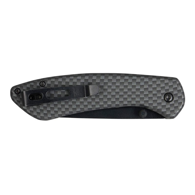 Bucks erstes Messer mit Button-Lock-Arretierung ist ein echter Hingucker. Auch wenn es auf den ersten Blick optisch zurückhaltend erscheint, wird man beim zweiten Hinschauen überrascht sein. Der Edelstahlgriff glänzt in Carbon-Optik und verleiht dem Messer ein modernes Aussehen. Über den Daumenpin kann die Klinge einhändig in die Arbeitsposition gebracht werden, wo sie dank der Button-Lock-Arretierung sicher verriegelt. Durch Drücken auf den eingelassenen Knopf lässt sich die Verriegelung lösen, um das Sovereign mithilfe des Taschenclips in der Hosentasche zu verstauen.
