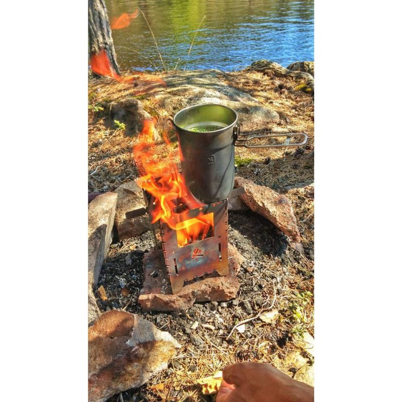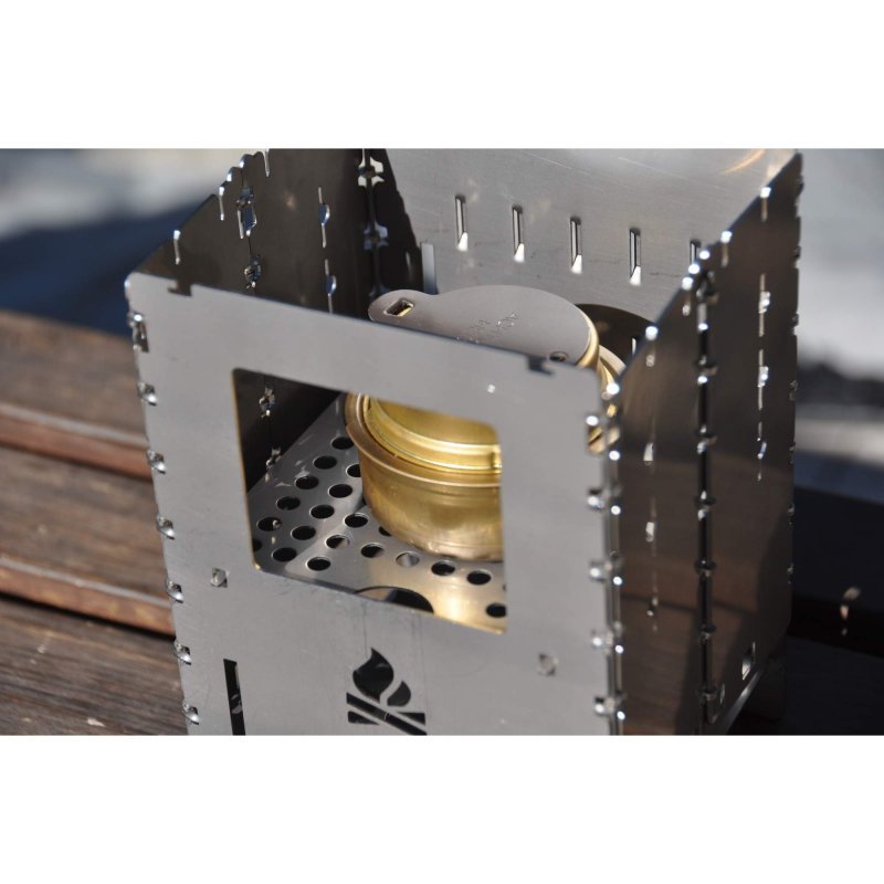Verbrennt Holz und kann auch mit einem Spiritusbrenner, Brennpaste und Esbitwürfeln betrieben werden