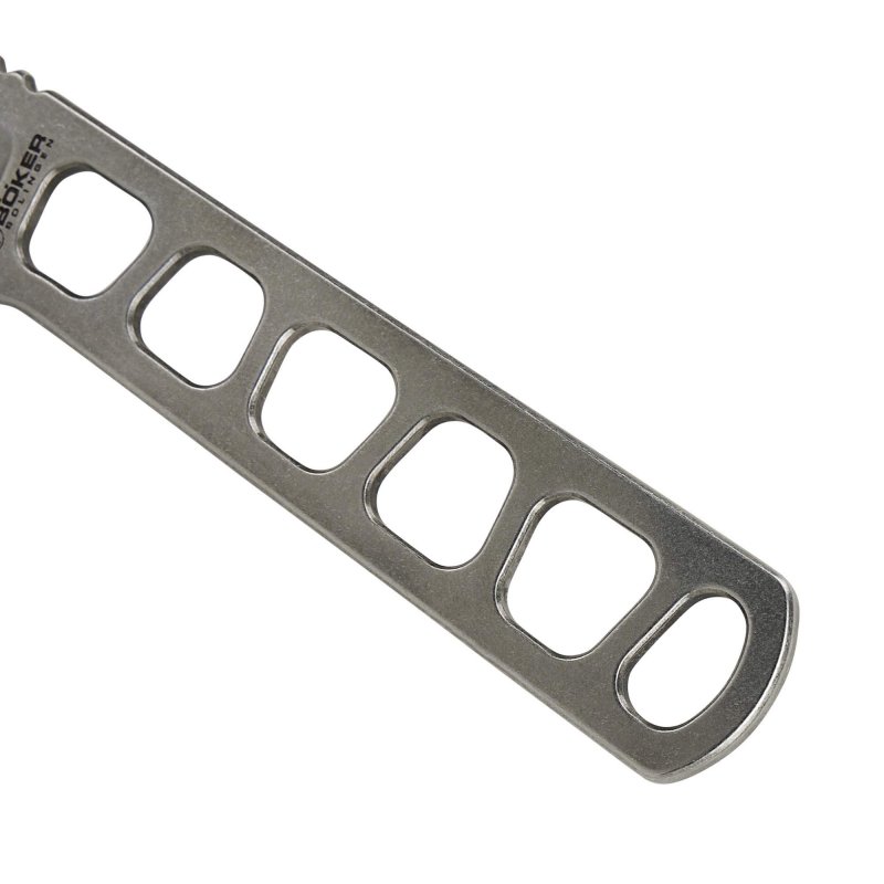 Die Ganzstahlkonstruktion besteht aus pulvermetallurgischem CPM MagnaCut-Stahl, der sich durch Zähigkeit und Rostbeständigkeit auszeichnet. Mit 61-62 HRC ist die Klinge zudem äußerst schnitthaltig. Der Griff ist mit gewichtsreduzierten Aussparungen versehen, wodurch das Messer lediglich 32 g wiegt. Abgerundet wird das Design durch ein mattes Stonewash-Finish.