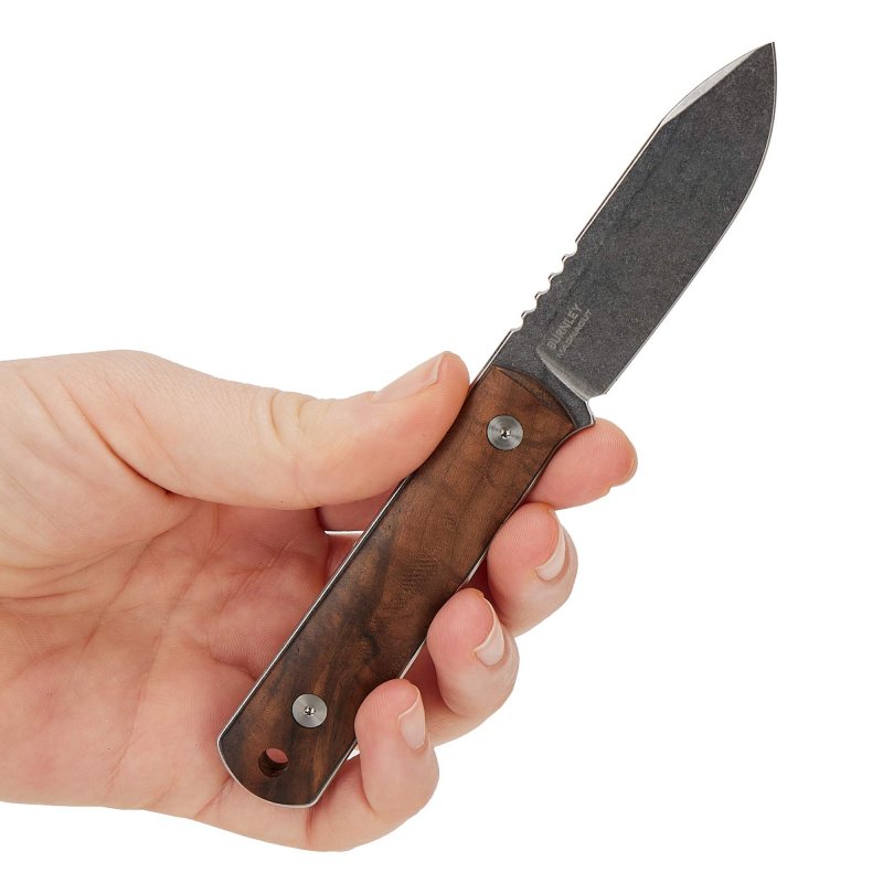 Die Ganzstahlkonstruktion besteht aus pulvermetallurgischem CPM MagnaCut-Stahl, der sich durch Zähigkeit und Rostbeständigkeit auszeichnet. Mit 61–62 HRC ist die Klinge zudem äußerst schnitthaltig. Der Griff ist mit verschraubten Walnussholzschalen versehen und liegt damit sehr angenehm in der Hand. Trotz der Griffschalen bringt das Messer lediglich 37 g auf die Waage. Abgerundet wird das Design durch ein mattes Stonewash-Finish der Klinge.