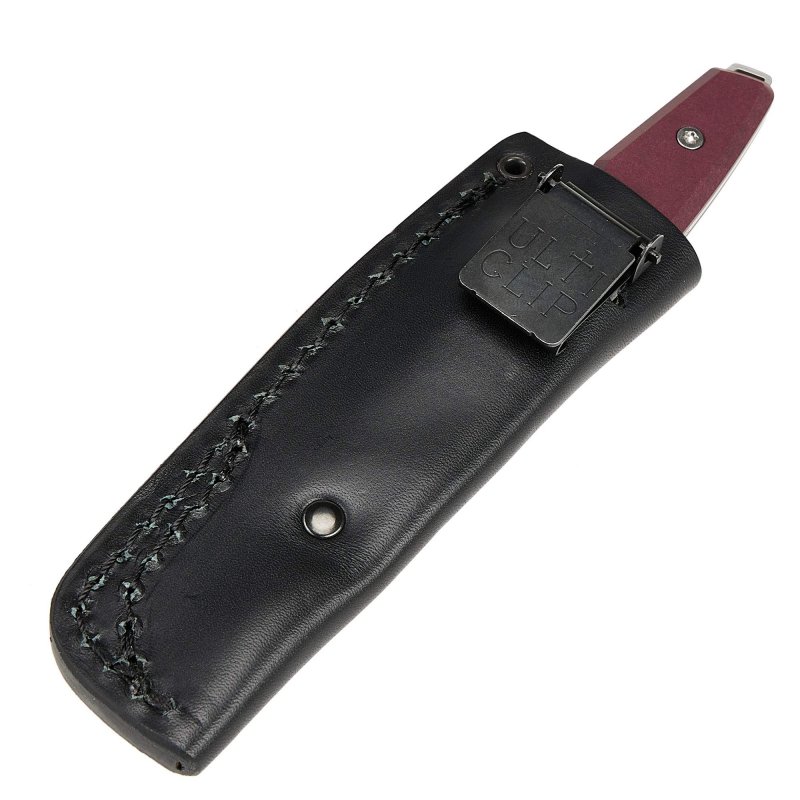Das AK1 wird in der mitgelieferten Lederscheide transportiert. Das 3 mm starke Leder ist mit einem Ulticlip ausgestattet, der die Befestigung am Hosenbund, an der Hosentasche oder am Gürtel ermöglicht. Durch die Spannvorrichtung des Clips kann das Messer einhändig gezogen werden, ohne dass du Gefahr läufst, die Scheide ebenfalls in der Hand zu halten.