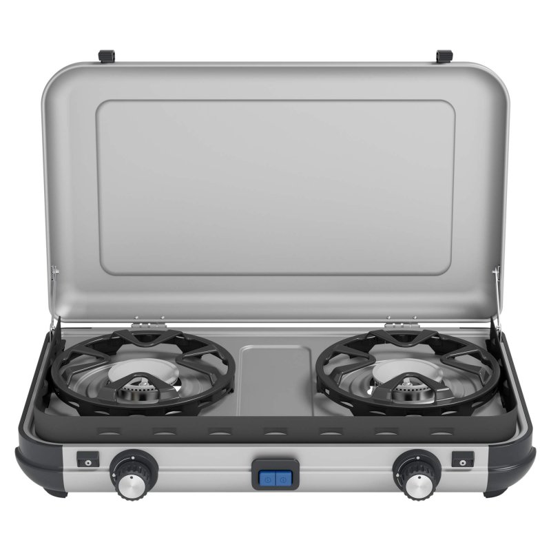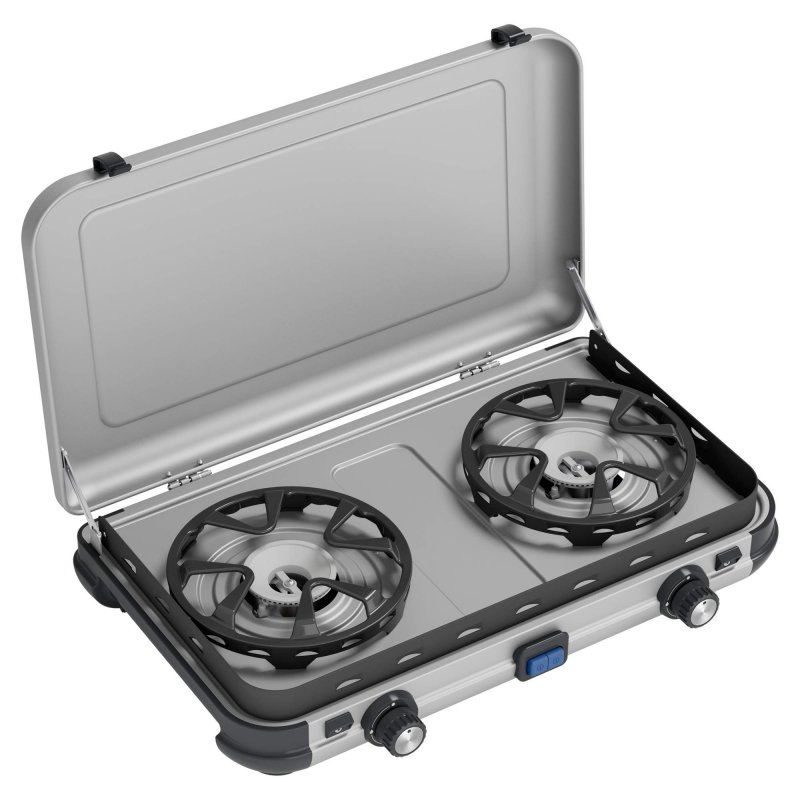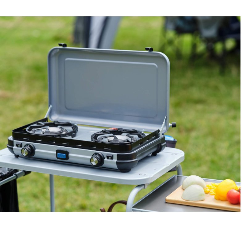 Der Camping Kitchen 2 Maxi ist mit zwei großen Kochflächenausgestattet, die Töpfe und Pfannen bis 28 cm Durchmesser aufnehmen können. Zwei getrennt regelbare Brenner leisten je bis zu 1800 Watt.