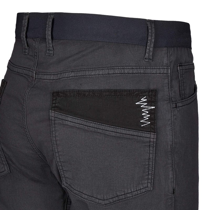 Die Hose hat den Schnitt einer klassischen Five-Pocket und wird per Knopf und Reißverschluss geschlossen. Dank des elastischen Zwickels im Schritt bietet die Hose auch bei extremen Moves absolute Bewegungsfreiheit. Die Knie sind leicht vorgeformt. Der elastische Bund ist besonders flach verarbeitet, sodass er unter dem Klettergurt nicht aufträgt.