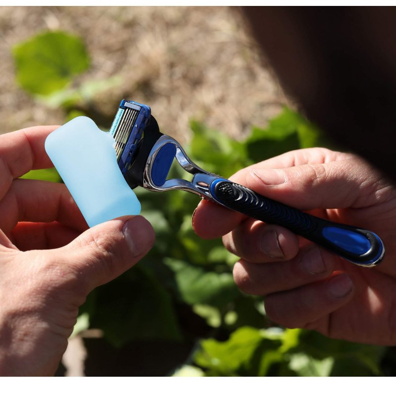 Praktische Schutzhülle aus Silikon für Nassrasierer. Sie schützt die Rasierklinge und andere Ausrüstung vor Schäden und lässt noch genügend Platz, damit du eine Ersatzklinge mitnehmen kannst.