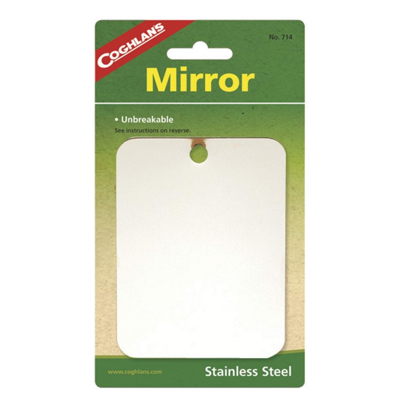 Der 11 x 8 cm große Spiegel besteht aus poliertem, rostfreiem Stahl und eignet sich hervorragend für Outdoortouren und lange Reisen, bei denen ein bruchfester Spiegel benötigt wird.