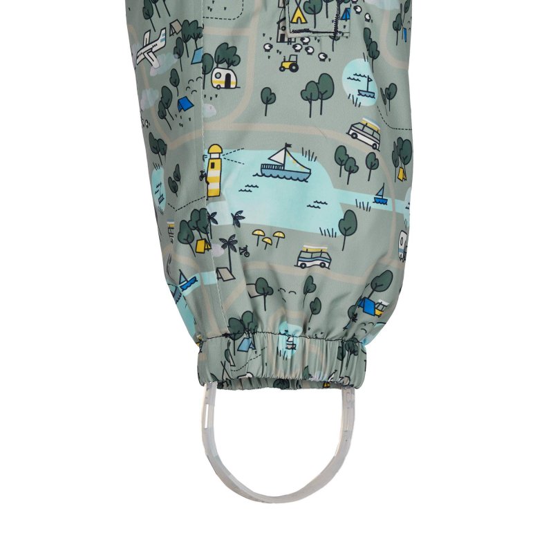 Der Front-Reißverschluss ist unterlegt und mit einer Windschutzleiste ausgestattet. So ist auch dieser Bereich bestens vor eindringender Nässe und Wind geschützt. Der Reißverschluss reicht bis zum linken Knie, dadurch lässt sich der Anzug schnell und unkompliziert an- und ausziehen. Auf Taillenhöhe sorgt ein Gummizug für einen guten Sitz. Dank der abtrennbaren, verstellbaren Stege an den Beinabschlüssen kann die Hose unter den Schuhen oder Gummistiefeln fixiert werden. Die Stege bestehen aus Silikon und sind besonders abriebfest. Die niedlichen Prints sorgen dafür, dass die Kids ihre Regenkleidung auch wirklich gerne anziehen.