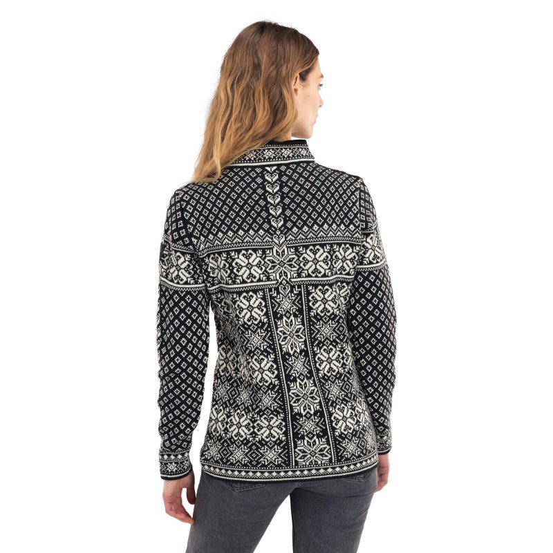 Das prächtige Strickmuster erninnert an Schneeflocken und sorgt direkt für wohlige Winterstimmung. Zentrales Element des Designs ist die achtblättrige Selbu-Rose, die auch im Wappen der Ortschaft Selbu in Mittelnorwegen vorkommt. Die Rose besteht aus vier Herzen, die dem Namen des Peace Sweaters entsprechend Frieden und Freundschaft symbolisieren. Die norwegischen Zinn-Knöpfe an den Ärmelbündchen, der Herz-Zipper und das aufwändig gestrickten Blumenmuster am Rand des Reißverschlusses runden das schöne, traditionelle Design des Pullovers ab. Ein echter Hingucker in der Skihütte oder auf der Weihnachtsfeier!