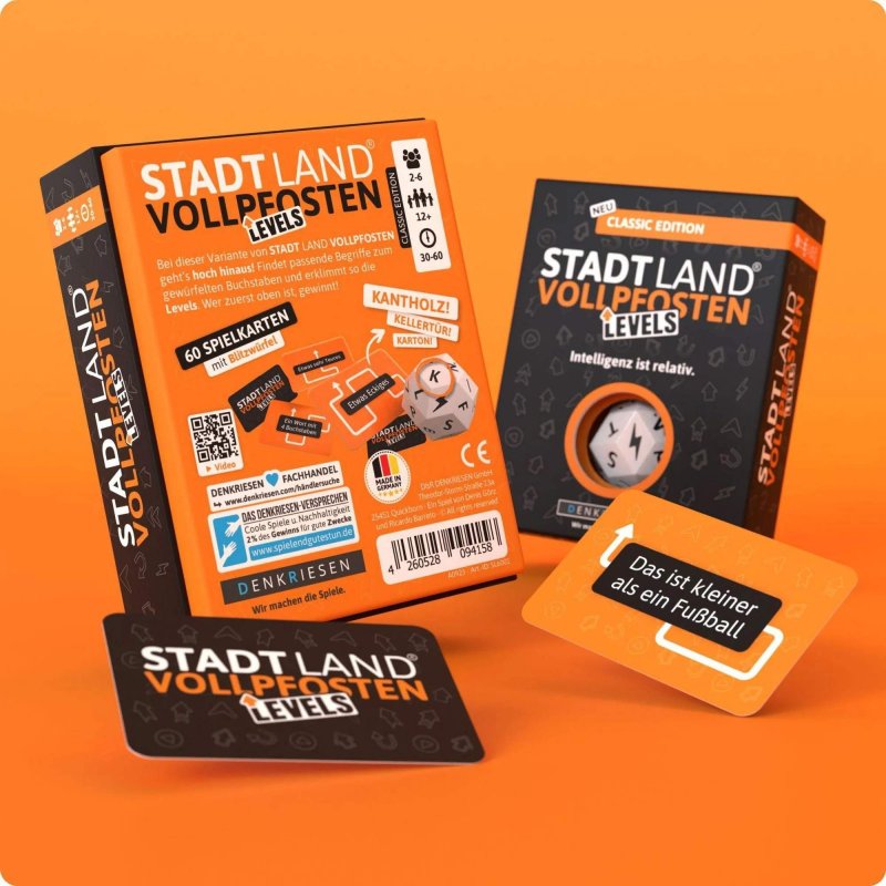 Erlebe mit "Stadt Land Vollpfosten – Levels" die neueste Variante des Klassikers 'Stadt Land Vollpfosten'. Die Spielkarten umfassen Neuheiten sowie bewährte Kategorien aus der bekannten Classic Edition. Würfelt euch hoch hinaus mit dem 28-seitigen Buchstabenwürfel. Das Ziel des Spiels ist es, als erster Spieler alle Karten seiner Pyramide loszuwerden, indem man passende Begriffe zu einem gewürfelten Buchstaben findet und die entsprechenden Level durchläuft, wobei in den höheren Levels keine Wiederholungen erlaubt sind.