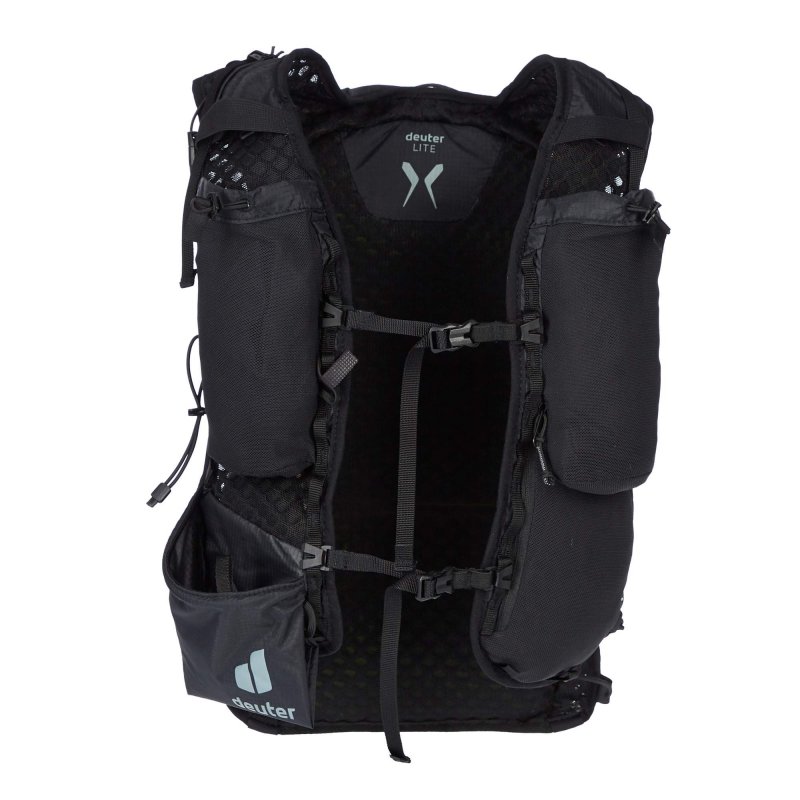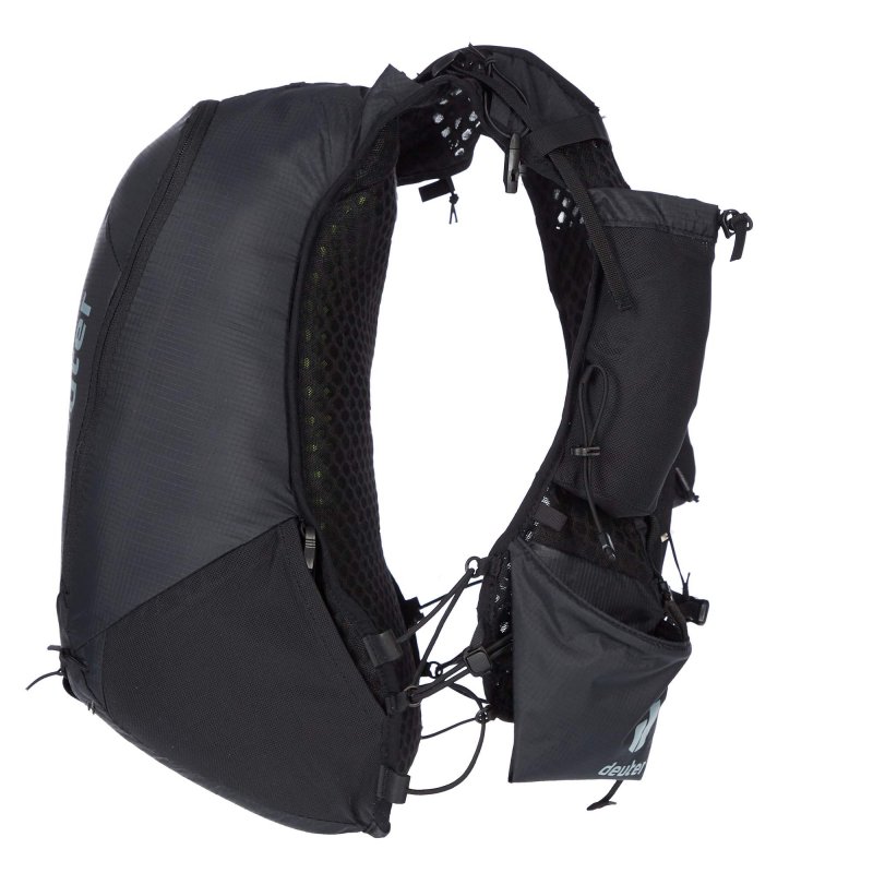 Der Trailrunning-Rucksack besteht aus einem leichten Ripstop-Material, das nicht beschwert. Die westenartige Konstruktion sorgt für einen anschmiegsamen und rutschfreien Sitz. Über zwei elastische Kordeln und die beiden verstellbaren Brustgurte kann die Passform des Tragesystems unkompliziert angepasst werden. Luftiges Mesh verhindert einen Hitzestau und kühlt beim Laufen angenehm. Ein Kondensationsschutz sorgt für einen trockeneren Rücken.