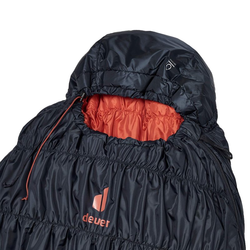 Die aufwendige Schindelkonstruktion des Füllmaterials mit 1,3-facher Überlappung sorgt für eine exzellente Isolierleistung. Eine zusätzliche Lage kommt im Fußbereich zum Einsatz und verstärkt die Isolierleistung in diesem sensiblen Bereich weiter. Zusätzlich ist im Kapuzen- und Fußbereich deuters Dryzone integriert. Diese ist mit einer zusätzlichen PU-Schicht versehen, um das Eindringen von Feuchtigkeit durch den Kontakt mit der Zeltwand zu verhindern. So erwarten dich am Morgen keine unangenehmen Überraschungen.