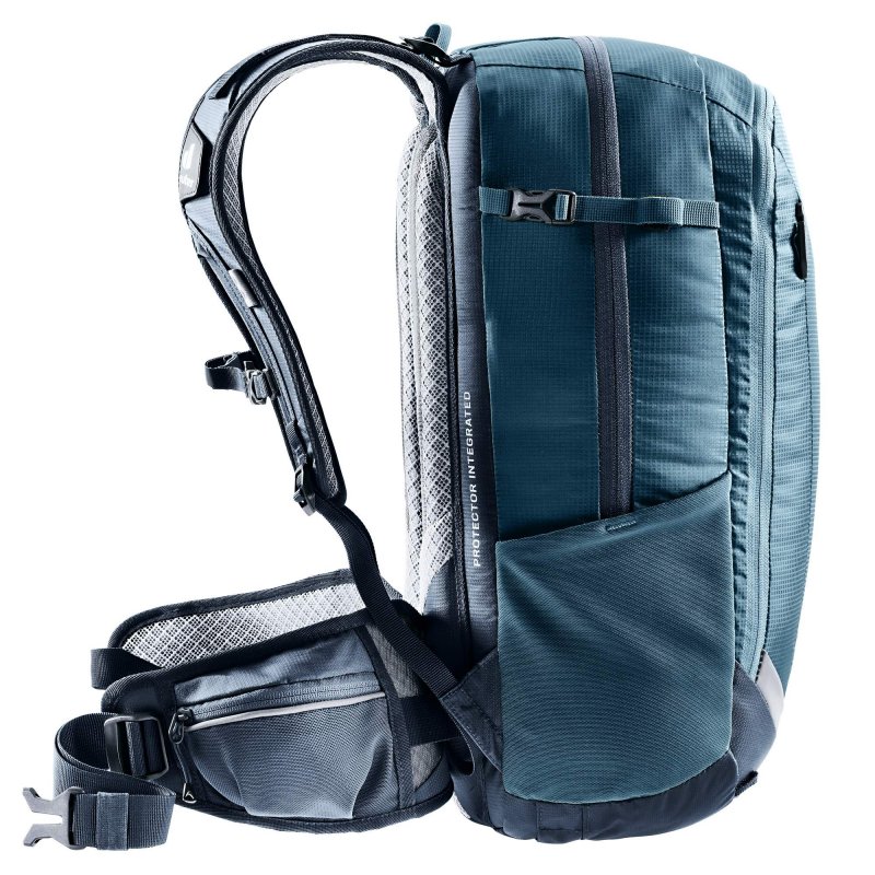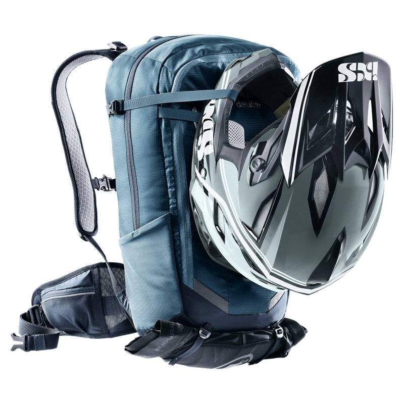Weniger ist mehr – der gewichtsoptimierte, TÜV/GS zertifizierte Protektor-Rucksack Flyt ist auf die essenziellen Features reduziert. So sorgt ein leichter, herausnehmbarer Rückenprotektor für Schutz bei Stürzen. Zur Fixierung des Helms gibt es Clips außen am Rucksack (Halbschalen-Helm) oder seitliche Kompressionsriemen (Fullface-Helm). Zwei verstaubare Riemen am unteren Ende des Rucksacks ermöglichen zudem die Befestigung der Bike-Protektoren. Das bewährte, leichte Airstripes-System sorgt zusätzlich für ausreichende, angenehme Belüftung am Rücken.