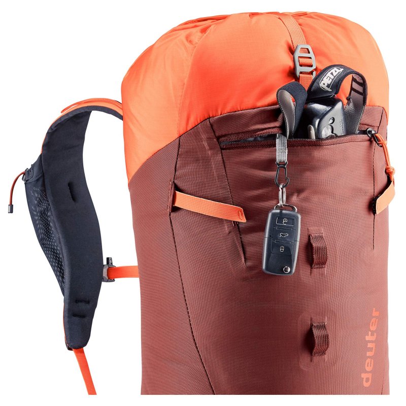 Der PFAS-freie Guide überzeugt durch niedriges Gewicht und zuverlässiges Handling. Robuste Materialien, hochwertige Verarbeitung, ausgefeilte Befestigungsmöglichkeiten für Pickel und Helm sowie die verstaubare Seilfixierung machen den Rucksack zum Klassiker für anspruchsvolle alpine Unternehmungen. Die Deckelkonstruktion erlaubt einen schnellen Zugriff auf das Hauptfach. Mit dem im Deckel integrierten, abnehmbaren Netz lässt sich der Helm je nach Bedarf entweder oben am Deckel oder an der Rucksackfront befestigen.