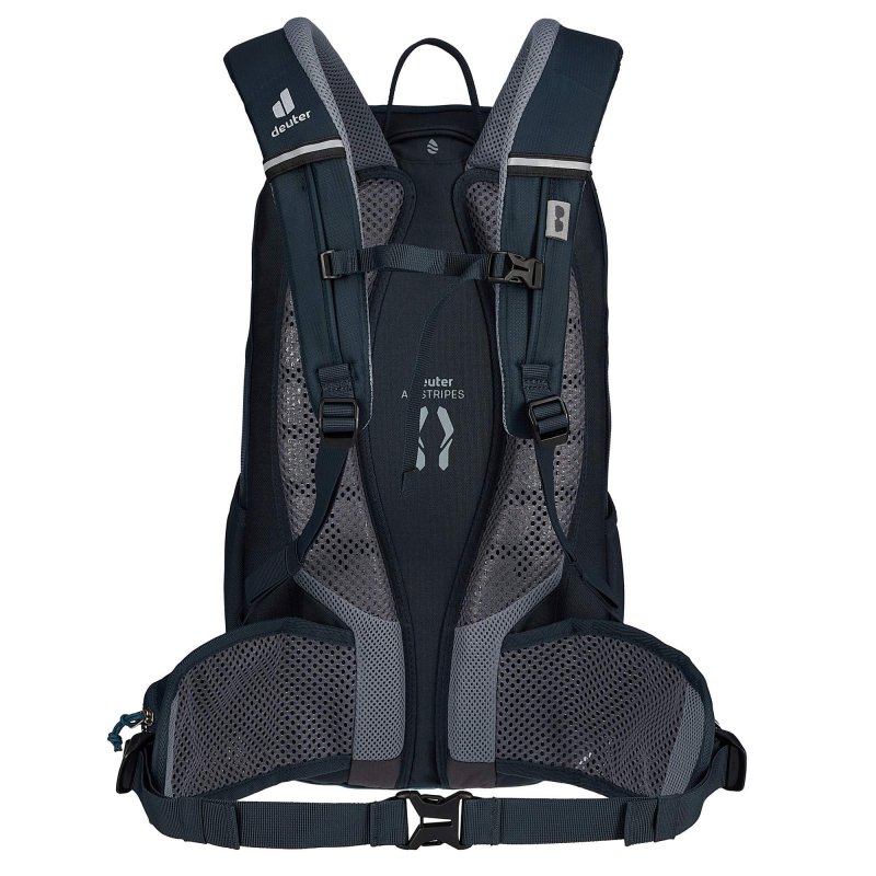 Deuter hat den Superbike 18 mit seinem bewährten Airstripes-Kontaktrücken bestückt. Dieser ist weich gepolstert und trägt sich in der Kombination mit den ergonomischen Schulterrücken auch bei voller Beladung noch äußerst bequem. Der Airstripes Luftkanal sorgt dabei für eine optimale Belüftung des Rückens. Damit du auf Tour auch alles Wichtige dabeihast und dabei stets den Überblick behältst, bietet der Fahrradrucksack neben dem geräumigen Hauptfach ein Frontfach für Wertgegenstände und kleinere Ausrüstung. Seitliche Steckfächer für Flaschen, Handschuhe und Co. sparen Platz im Hauptfach.