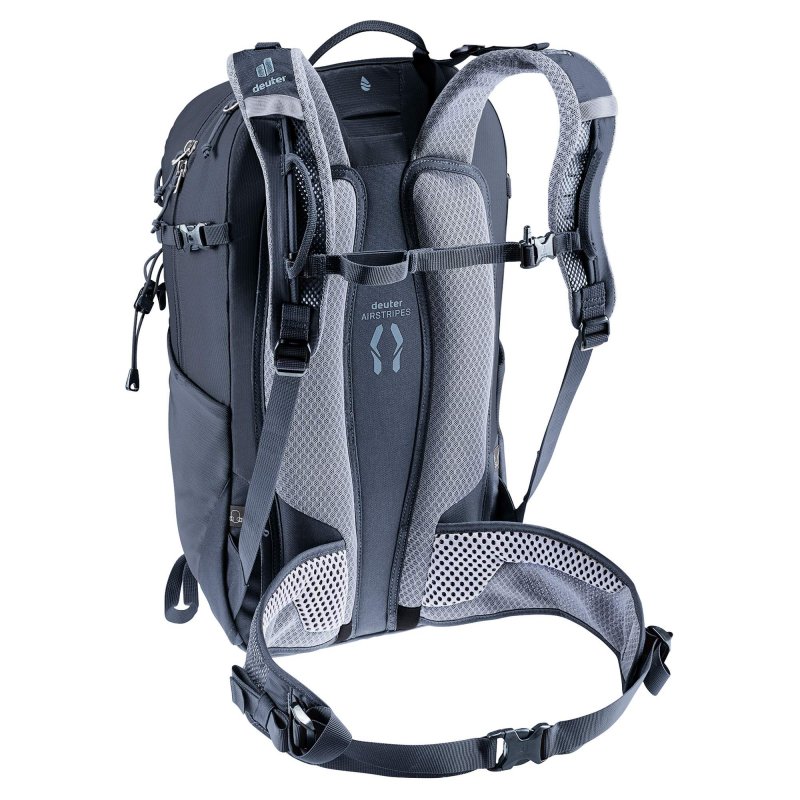 Das Airstripes Rückensystem mit geringer Rückenauflage und großen Belüftungskanälen sowie die perforierten Schulterträger und Hüftflossen sorgen für optimale Luftzirkulation, körpernahe Gewichtsverteilung und damit einen kompakten Sitz in jedem Terrain. Dank Fixierungen an den Schulterträgern sind die Karabiner des Klettersteigsets stets griffbereit. Zudem sind Ausrüstungsgegenstände und Material dank großer Rundbogenöffnung mit Reißverschluss, elastischer Frontstecktasche und Seitentaschen schnell zur Hand.