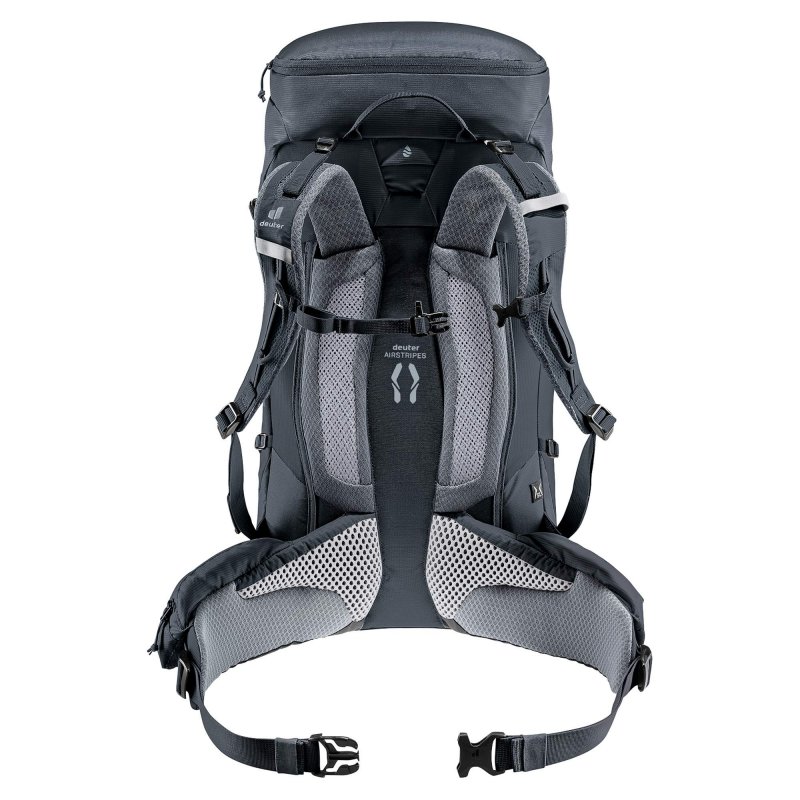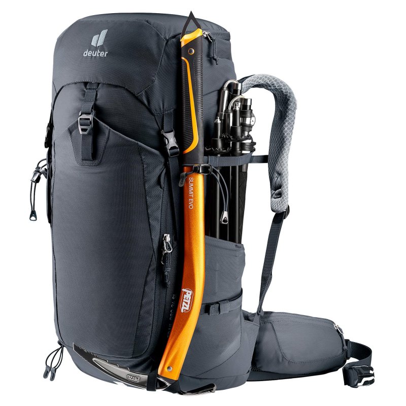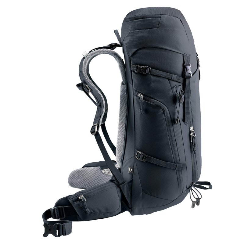 Das Airstripes Rückensystem mit geringer Auflagefläche und luftdurchlässigem, schnell trocknendem Air Spacer Mesh sorgt zusammen mit den perforierten Schulterträgern und Hüftflossen für maximale Belüftung, gute Lastverteilung und kompakten Sitz auf Mehrtagestouren mit Klettersteig. Dank Fixierungen an den Schulterträgern sind die Karabiner des Klettersteigsets stets griffbereit und das Material durch den großen Reißverschluss-Hauptfachzugang, die elastischen Seitentaschen und das separate Bodenfach gut sortiert und schnell verräumt.
