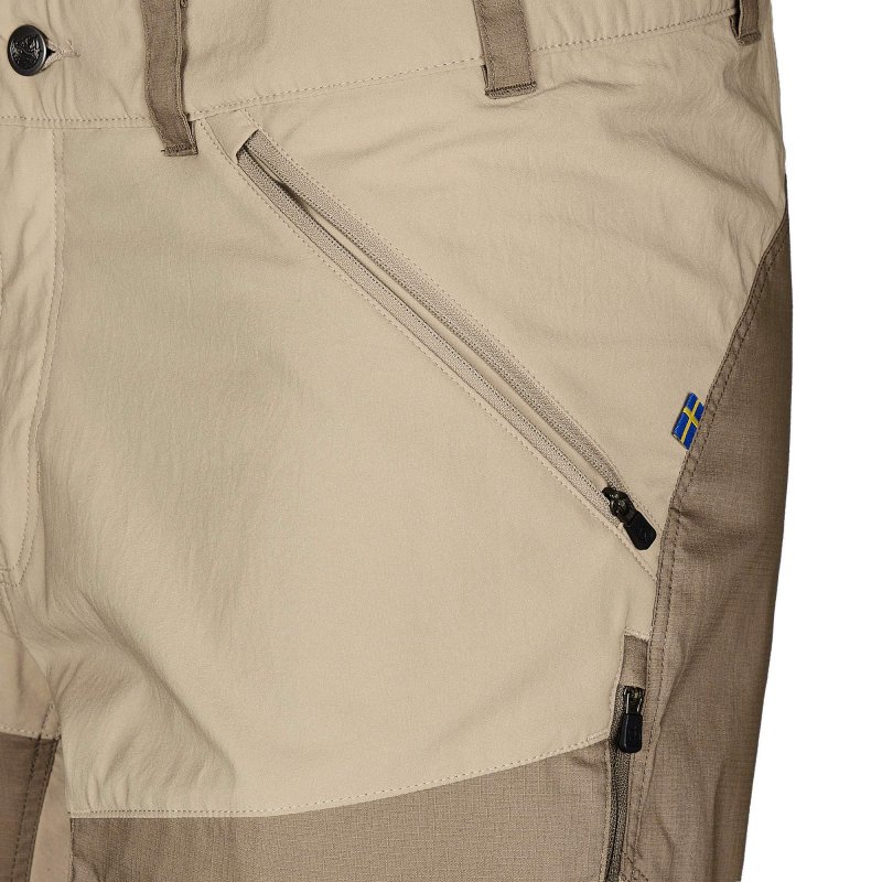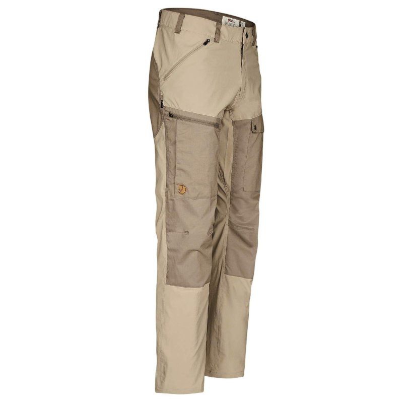 Am Gesäß, an den Oberschenkeln und an den Knien schützt das etwas robustere G-1000 Air Stretch-Material vor Abrieb. Das Material ist das dünnste und leichteste Material aus Fjällrävens G-1000-Serie. Es ist besonders locker gewebt, wodurch es besonders atmungsaktiv ist. Um den Luft- und Feuchtigkeitsaustausch nicht einzuschränken, wurde die Hose nicht gewachst. Hierdurch ist sie allerdings auch nicht wasserabweisend.