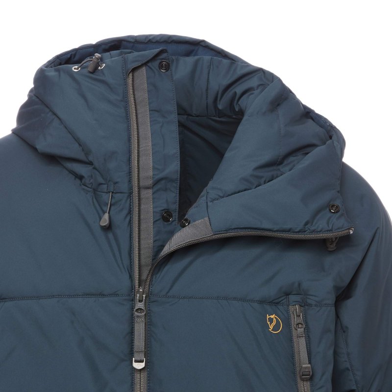 Dadurch eignet sich die Jacke hervorragend für durchwachsenes Wetter, bei dem auch mal mit Schauern oder wenigstens sehr nassem Schnee zu rechnen ist. Trotzdem muss die Füllung ja nicht unbedingt nass und damit schwer werden; das dachte man sich auch bei Fjällräven und verpasste der Jacke eine DWR-Imprägnierung. Dadurch ist die Jacke zwar nicht wasserdicht, aber doch so abweisend, dass du bei kurzen Schauern oder Ähnlichem noch nicht die Hardshell auspacken musst. Und für frostiges Wetter sind spezielle Zipper verarbeitet wurden, die du problemlos auch mit Handschuhen bedienen kannst.