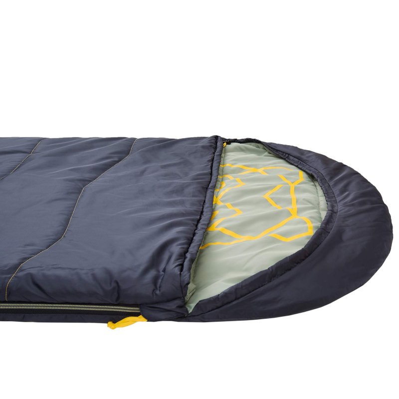 Der lange Reißverschluss von YKK ist mit einem Anti-Snag-Schieber ausgestattet, der effektiv das Einklemmen des Stoffes bei der Bedienung verhindert. Durch die umlaufende Form kann der Schlafsack vollständig geöffnet werden und dient damit auch als große Decke.