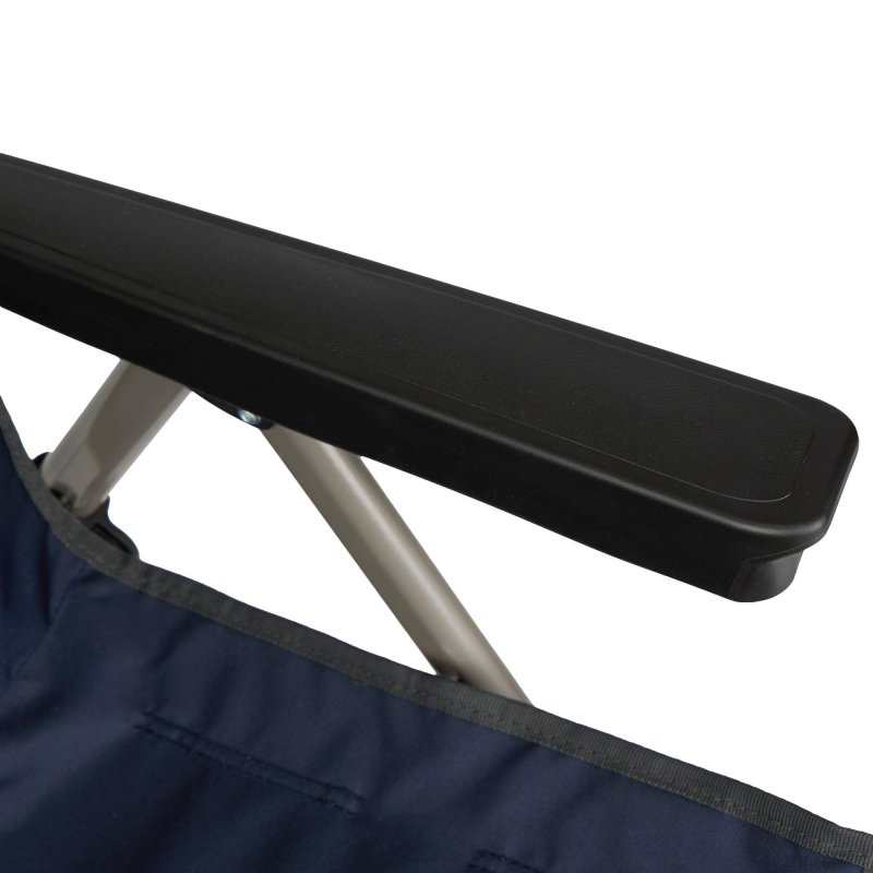 Sehr komfortabler Faltstuhl mit extra breiter Sitzfläche, dreifach verstellbarer Rückenlehne und Recycling-Polyester-Bezug. Aufrecht am Tisch und ausgestreckt in der Sonne geht also beides prima!