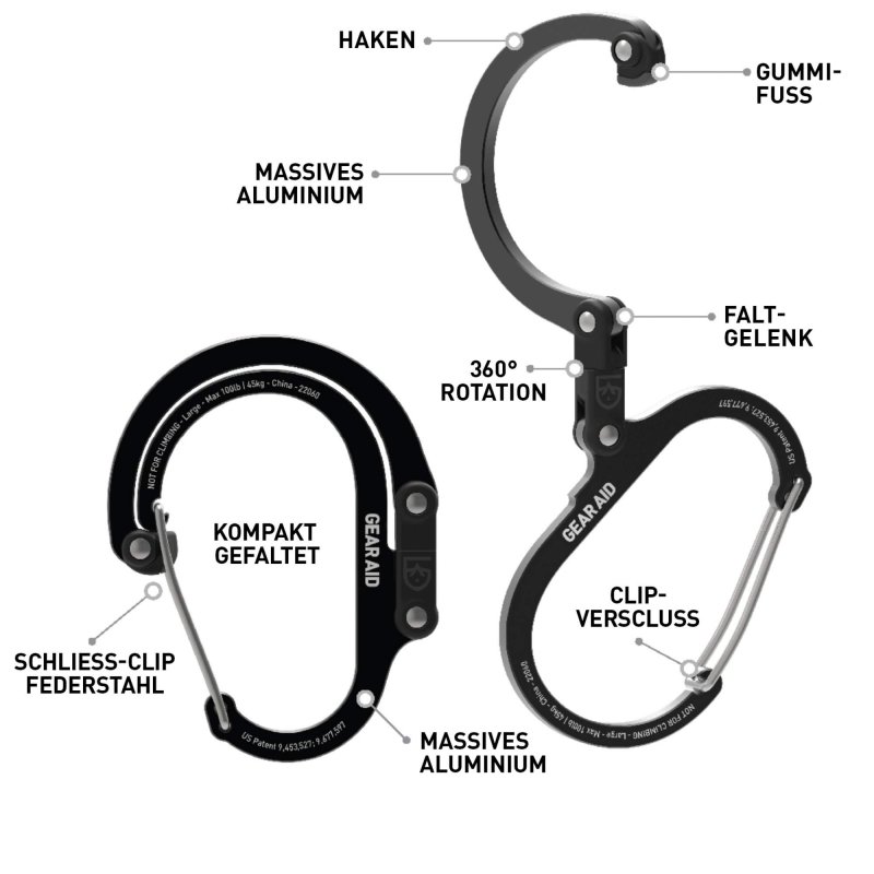 Mit dem Hero-Clip ist ein Karabiner mit klappbarem Haken. Mit ihm lassen sich zu Hause und unterwegs größere Ausrüstungsgegenstände aufhängen und durch das Drehgelenk platzsparend verstauen.