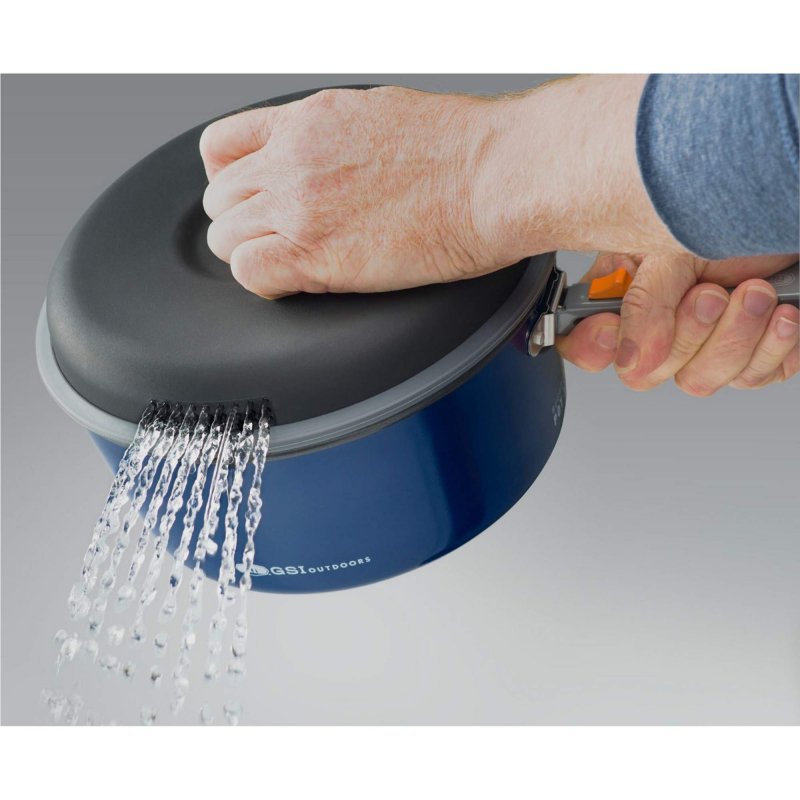 Unglaublich, was alles aus dem großen Topf gezaubert werden kann – und das gleich in doppelter Hinsicht! Denn alle Teile können zunächst platzsparend ineinander gestapelt werden. Dadurch ist es möglich, das Set kompakt zu verstauen. Andererseits lassen sich in den beiden Töpfen und der großen Pfanne herzhafte Gerichte für die ganze Familie zubereiten. Um sicherzustellen, dass nichts anbrennt, sind alle Teile mit einer Keramikbeschichtung versehen. Diese ermöglicht es, Zutaten wie Zwiebeln und Fleisch direkt im Topf anzubraten und Gerichte über einen längeren Zeitraum köcheln zu lassen, ohne dass das Essen ansetzt. Für einen stabilen Stand auf dem Campingkocher sind die Böden der Töpfe mit einem Spiralmuster versehen.
