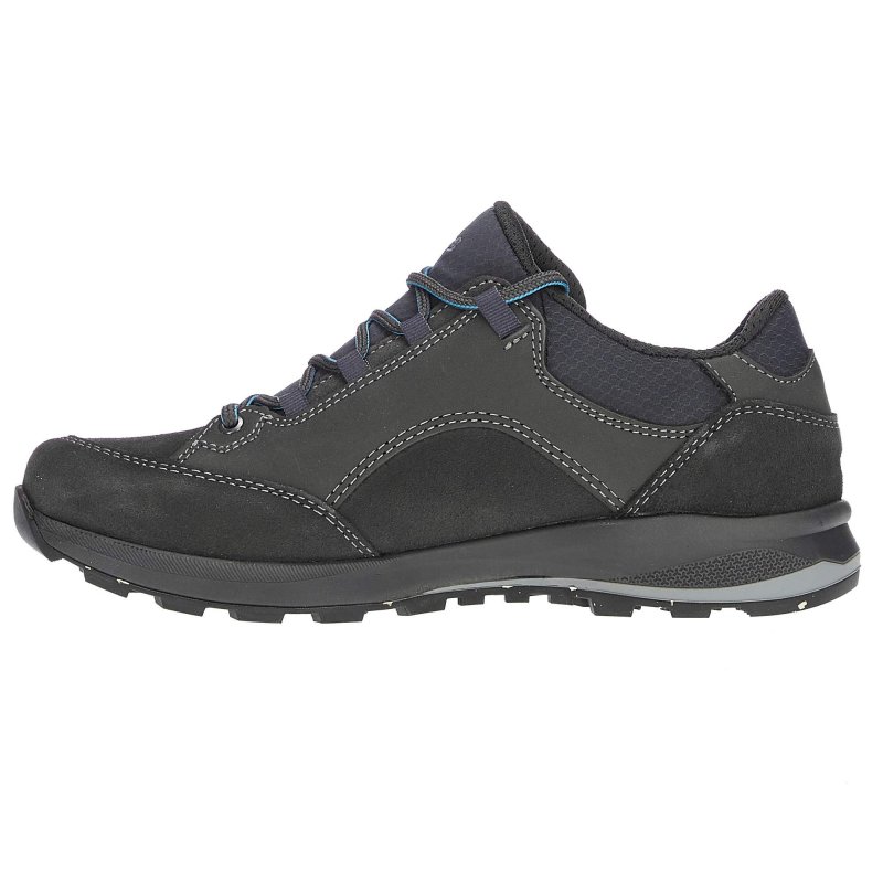 Wichtigster Unterschied zum Stiefel ist die Sohlenkonstruktion. Die ist insgesamt flacher, verfügt aber vor allem im Fersenbereich über einen weniger kräftigen Fersenkeil der Zwischensohle. Damit hier trotzdem eine gewisse Torisonssteife gewährleistet werden kann, wurde ein Keil aus härterem Gummi verarbeitet. Die Laufsohle mit dem klangvollen Namen "Hanwag Endurance Hike", besteht dabei übrigens aus 10% recyceltem Gummi.