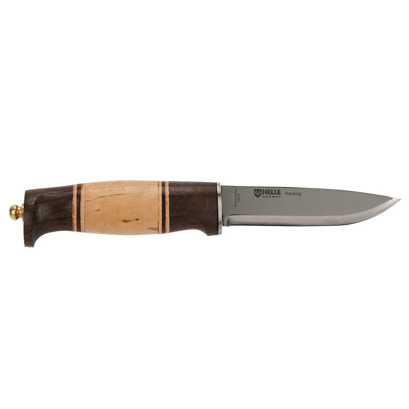 Das Harding ist ein traditionelles skandinavisches Jagdmesser, das 1986 von Erling Opstad entworfen wurde. Besonders auffällig ist der wunderschön gestaltete Griff, der äußerst angenehm in der Hand liegt. Neben hartem Maserbirkenholz wird dunkel gefärbtes Eichenholz verwendet, das durch farbige Ledereinsätze stilvoll in Szene gesetzt wird.