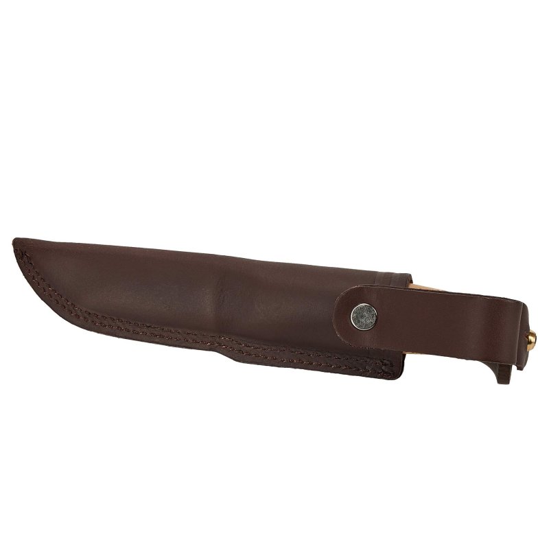 Das Harding wird in einer hochwertigen Lederscheide transportiert. Die Lasche auf der Rückseite der Scheide wird über den messingfarbenen Knauf am Griffende gezogen, wodurch das Messer sicher vor dem Herausfallen geschützt ist.
