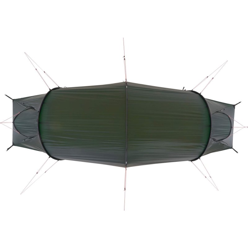Das Innenzelt hat eine lange Liegefläche von 220 cm. Insgesamt 4 Netztaschen ermöglichen das separate Verpacken von Taschenlampen, Karten und anderer Ausrüstung. Da das Innenzelt mittig im Zelt angebracht ist, kann eine fast durchgängige Innenzelthöhe erreicht werden, obwohl das Zelt zu den Enden hin abfällt. Das weißt du besonders an Tagen zu schätzen, an denen ein längerer Aufenthalt im Zelt nötig ist. So kannst du entspannt mit deinem Mitreisenden im Zelt sitzen, Karten spielen oder lesen. Eine im Innenzelt gespannte Wäscheleine ermöglicht das Trocknen und Lüften von feuchten Ausrüstungsgegenständen.