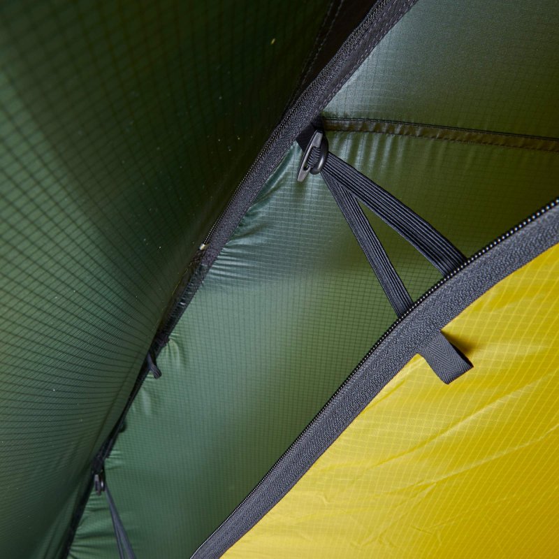 Das Unna verzichtet auf eine Apsis, schafft jedoch Platz für deinen Rucksack im Innenzelt. Mit einer Breite von 110 cm haben neben der Isomatte auch noch Kleidung und Schuhe Platz. Hier bleibt alles trocken und sauber. Die Innenzeltlänge von 230 cm bietet auch sehr großen Personen ausreichend Raum. Eine Netz-Innentasche bietet Platz für Smartphone, E-Reader oder deine Wanderkarte. Für ausreichende Belüftung sorgt der hoch angebrachte Lüfter im Deckenbereich. Die Innenzeltventilation ist im Eingang integriert und verschließbar.