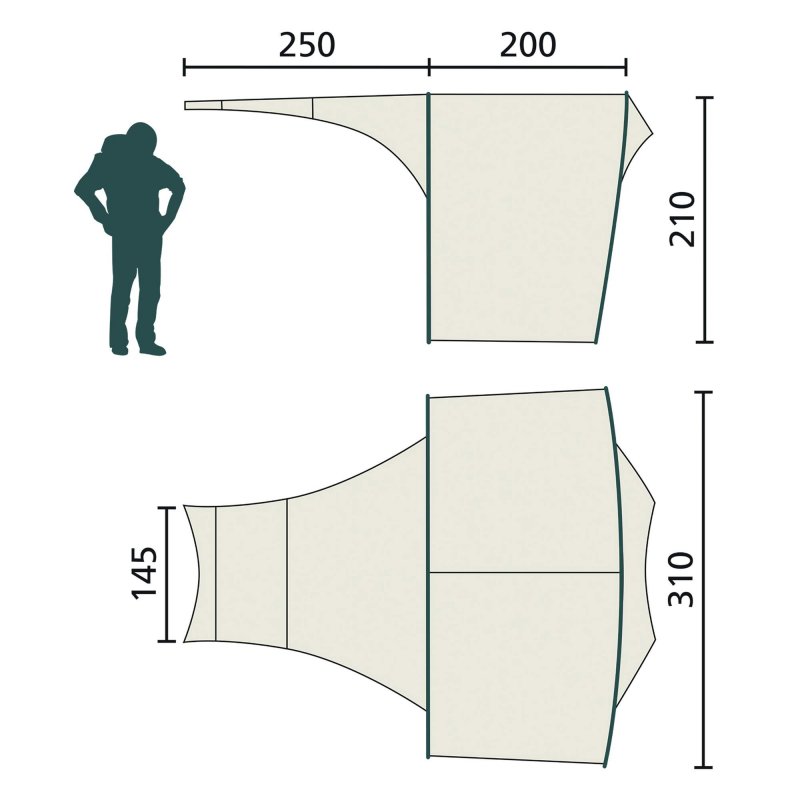Das Vordach ist mit allen Familienzelten von Jack Wolfskin kompatibel und wird direkt vor den Eingang gestellt. Er bietet rund 7 m² und erweitert den Aufenthalts- und Lagerraum des Zeltes.