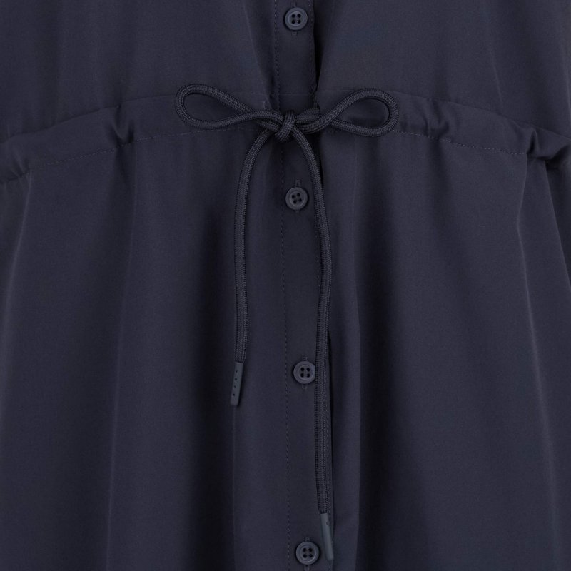 Durch die halblangen Ärmel und den umgeschlagenen Kragen eignet sich das leichte Kleid auch für sommerliche Bürotage. Der weite Schnitt lässt sich dank des Kordelzugs in der Taille femininer gestallten. Abgerundet wird das Ganze von einer durchgehenden Knopfleiste und kurzen, seitlichen Bewegungsschlitzen.