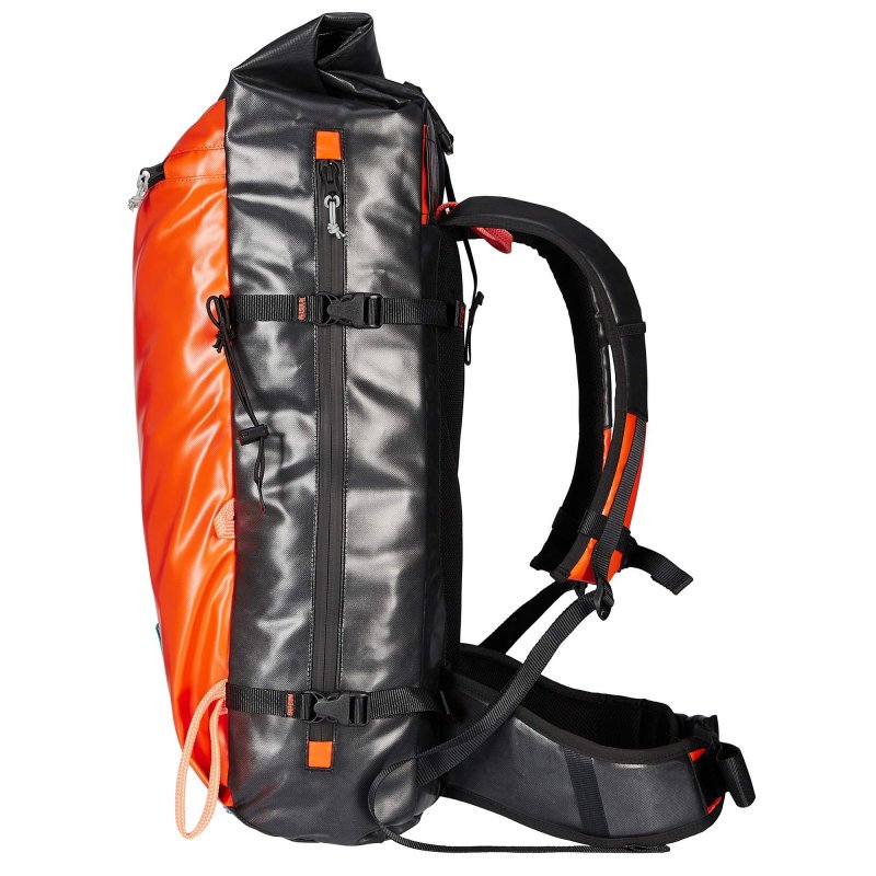 Skier, Kletterseil, Helm und Eispickel, alles kann am Uback befestigt werden. Er eignet sich also auch für Bergtouren und Kletterpartien. Der Hüftgurt ist mit einer Materialschlaufe versehen, in der Materialkarabiner eingehängt werden können. Auf der Front befindet sich ein großes RV-Fach, in das Schaufel und Lawinensonde passen. Äußerst praktisch sind das Rolltop und der große seitliche RV, mit dem du den Tourenrucksack wie eine Tasche weit öffnen kannst. So hast du auch im Notfall schnell Zugriff auf den Inhalt.