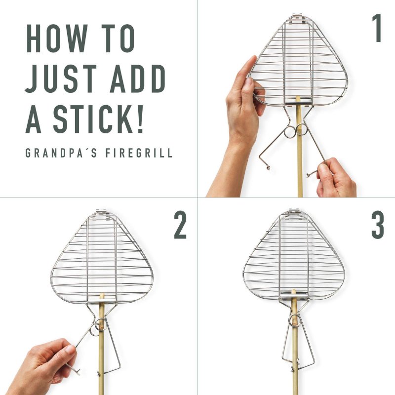 GrandPa's FireGrill ist ein klappbarer Grillrost, der in seiner Mitte Würstchen, Fleisch oder Gemüse sicher und verlustfrei festhält. Mithilfe eines Stocks kannst du den Grillrost über die Glut halten. Geht es größeren Würstchen, Maiskolben oder Marshmallows an den Kragen, greifst du zu GrandPa's FireFork Bio. Die Gabel wird ebenfalls an einem Stock befestigt und richtet dank ihrer Schutzkappe im Gepäck keinen Schaden an. Damit das Feuer überhaupt anfängt zu brennen, befindet sich ein Tinder-on-a-Rope (Fatwood) und ein Swedish FireSteel scout Bio (Feuerstarter) im Paket. Damit kannst du bei jeder Witterung ein Feuer entfachen.