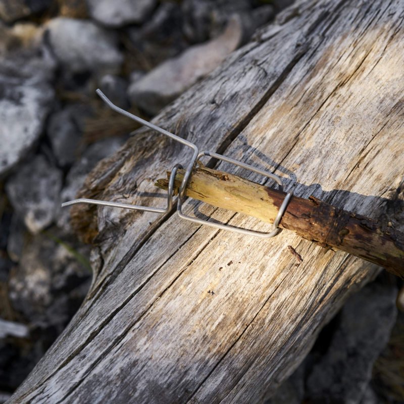 Mit der Firefork wird der Grillstock zum Profiwerkzeug. Einfach anklemmen, Würstchen, Fisch oder Gemüse aufspießen und über das Lagerfeuer halten.