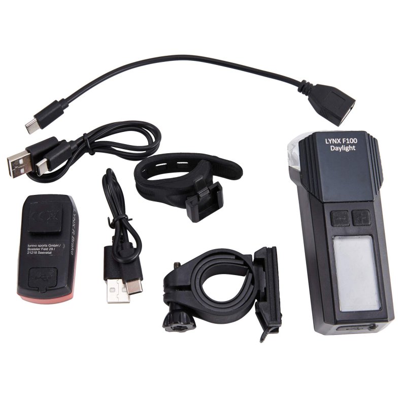 Ein großer Lichtkegel bis 40 Meter bei Dunkelheit, 4 verschiedene Leuchtstufen plus Tagfahrlicht sowie ein informatives Display - und die Funktion als Powerbank, das bringt der Frontscheinwerfer aus diesem Set mit; das Rücklicht Lynx R Brake hat eine Bremslichtfunktion mit vier zusätzlichen LED und Bewegungssensor.