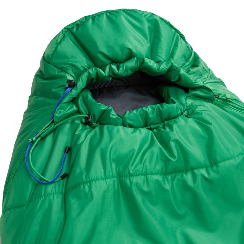 Der Schlafsack verfügt über Reißverschlüsse auf beiden Seiten. Der lange Hauptreißverschluss ist mit einem Anti-Snag-Zipper ausgestattet, der ein Einklemmen des Materials verhindert. Zudem kann er von unten zur Belüftung geöffnet werden. Auf der rechten Seite befindet sich ein 35 cm langer Reißverschluss, der ebenfalls zur Belüftung dient oder morgens für mehr Bewegungsfreiheit sorgt.