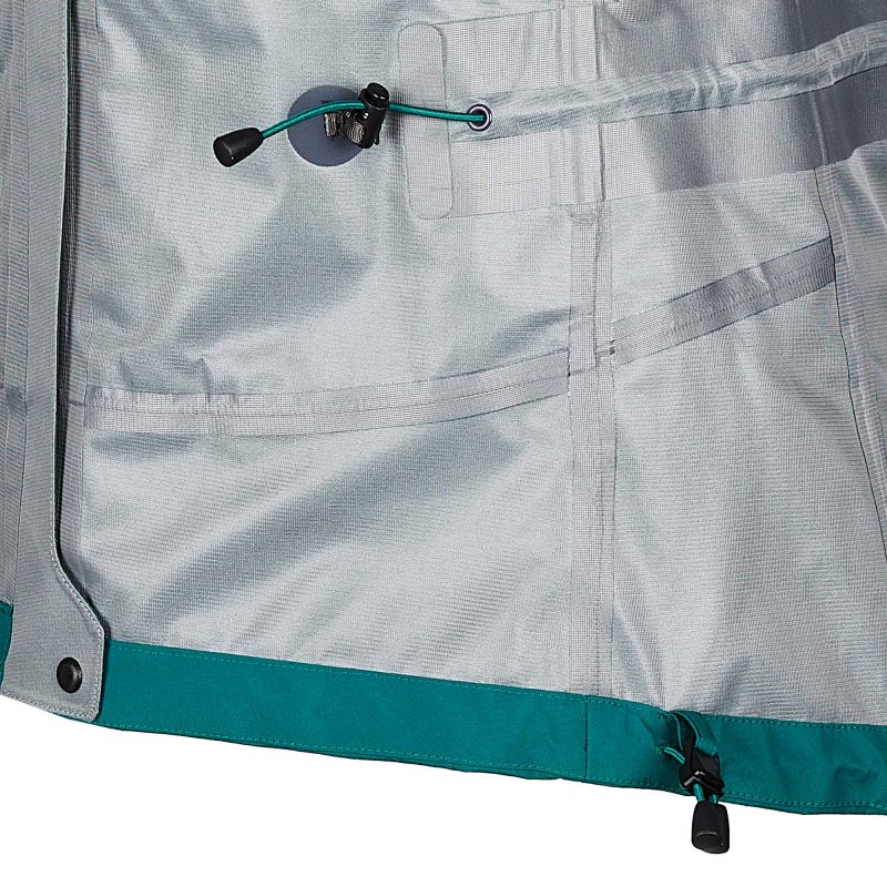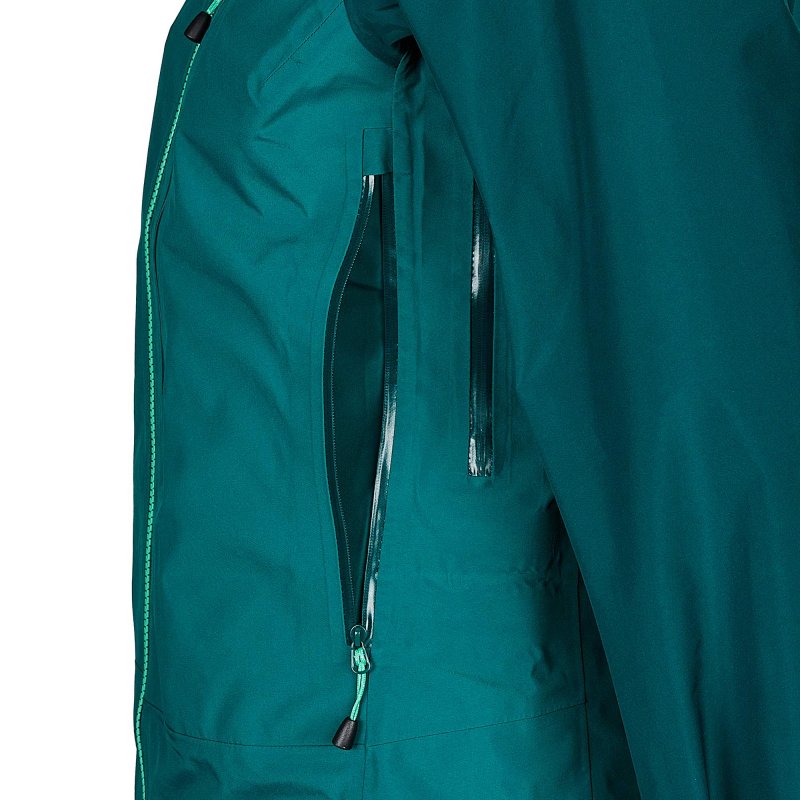 Der hohe Kragen und die helmtaugliche Kapuze mit Volumen-Regulierung vorne und hinten verbessern den Schutz bei stürmischem Regenwetter. Benötigst du nach einem anstrengenden Aufstieg hingegen etwas Abkühlung, bieten sich die 2-Wege-RV-Unterarmbelüftungen an. Die beiden RV-Einschubtaschen sind durchdacht höher angebracht. So stören sie dich nicht, wenn du einen Klettergurt trägst. Zudem bieten sie dir genau wie die RV-Brusttasche eine Menge Stauraum für Karabiner, GPS und Co.