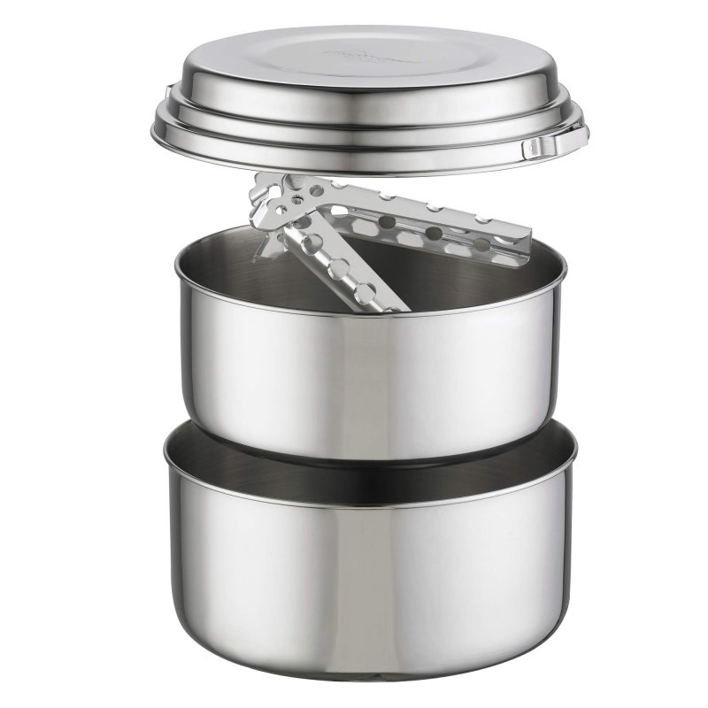 Ein nahezu unverwüstliches Topfset, das selbst häufige Einsätze nicht scheut. Hergestellt aus Edelstahl und für einen platzsparenden Transport ineinander stapelbar. Geeignet für zwei Personen.