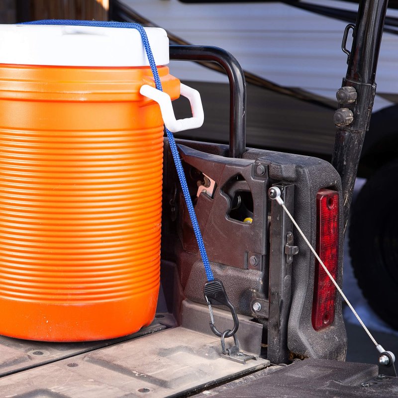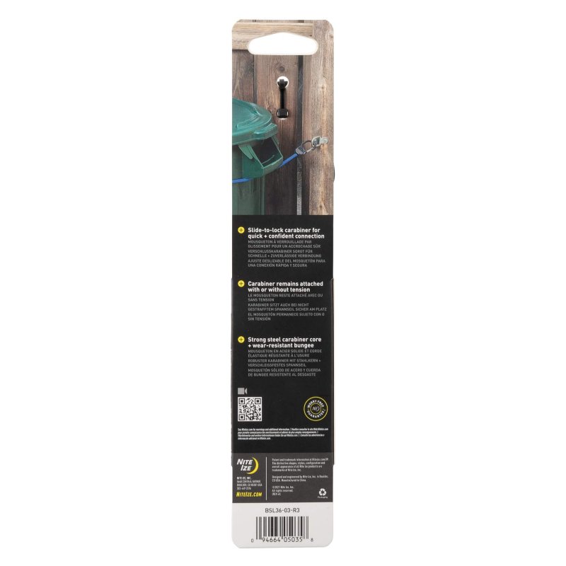 Der Sidelock Carabiner Bungee besteht aus einem elastischen Band und zwei Karabinern, dessen Öffnungen mit einer Schiebeverriegelung gesichert werden können.