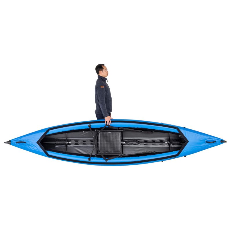 In dem mitgelieferten Packsack, der sich auch bequem als Rucksack tragen lässt, kannst du den Scubi XL mühelos zur Einsatzstelle transportieren. Vor Ort ist er schnell einsatzbereit: das aufs Wesentlichste reduzierte Gestänge ist fix positioniert und die Luftschläuche schnell gefüllt. Mit etwas Übung ist der Einsitzer innerhalb von 10 bis 15 Minuten fahrtüchtig!