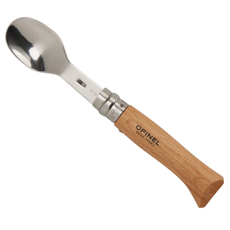 Mit dieser Erweiterung für ein Opinel-Messer der Größe 08 (separat erhältlich) wird der Anwendungsbereich des Messers grundlegend erweitert. In Zusammenarbeit mit dem Designer Franck Fontana wurden ein Löffel und eine Gabel entwickelt, die sich im Griff des Messers befestigen lassen. Hierzu wird die Messerklinge eingeklappt und das Besteckteil in den Spalt am Ende des Griffs gesteckt. Durch den Lockring wird der Einsatz anschließend fixiert und in Position gehalten.