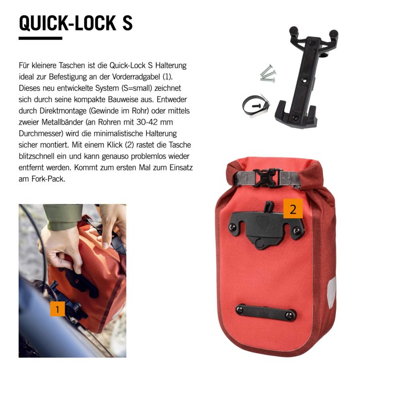 Dank Federmechanismus und spezieller Adapterplatte ist das Quick-Lock S System eins der ganz fixen: Hast du die Adapterplatte erstmal an den Gewindebohrungen deiner Gabel befestigt, lässt sich das Fork-Pack Plus in Sekundenschnelle und sicher an der Gabel fixieren und wieder abnehmen. Ein narrensicheres sowie zuverlässiges System von Ortlieb.