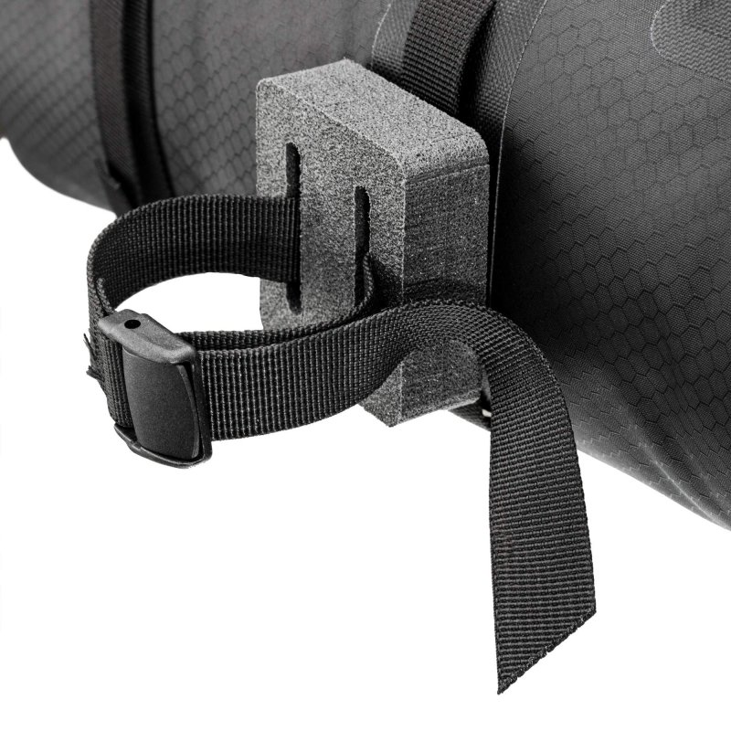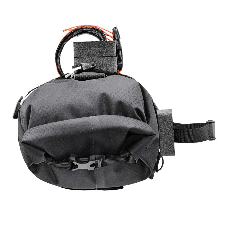 Die vier Leichtmetallhaken mit Klemmschnalle am Riemen dienen der Kompression und können zudem das Accessory-Pack auf der Vorderseite des Handlelbar-Pack fixieren.