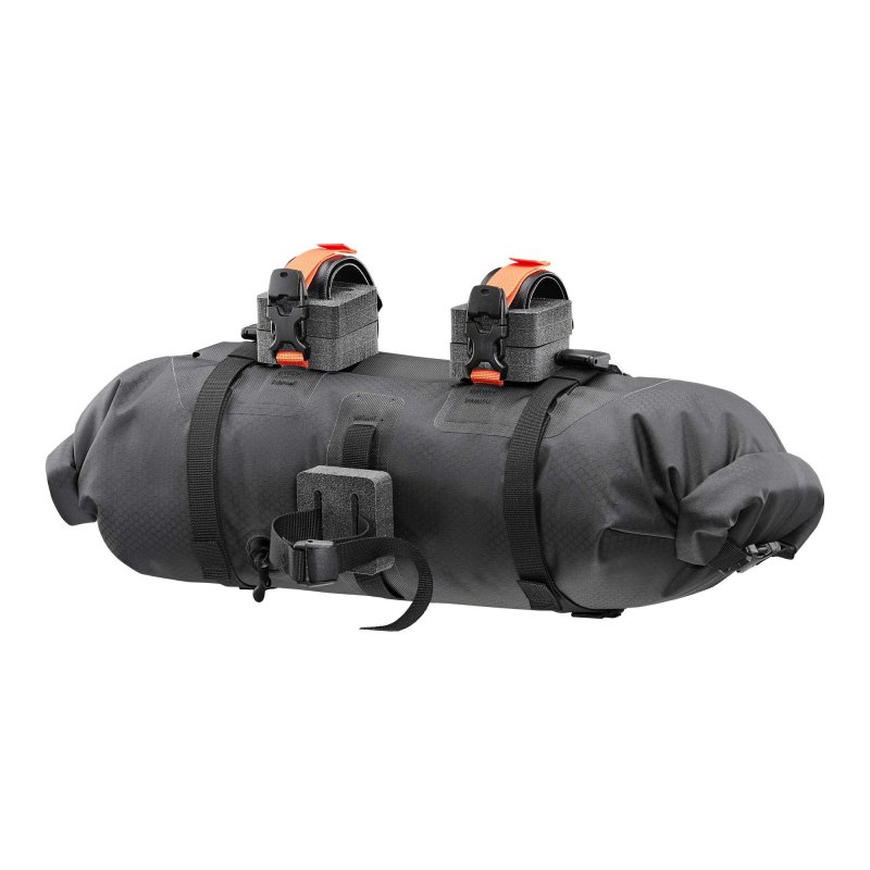 Lenkertasche für die Montage an allen Lenkertypen. Mit seitlichem Rollverschluss, Kompressionsventil und starken Gurten zur Fixierung. 9 l Taschenvolumen.