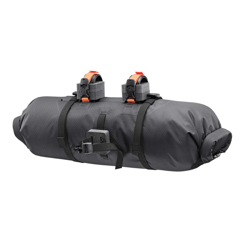 Große Lenkertasche für die Montage an geraden Lenkertypen. Mit seitlichem Rollverschluss, Gepäckband auf der Vorderseite, Kompressionsventil und starken Gurten zur Fixierung. 15 l Taschenvolumen.